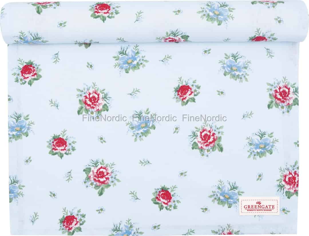 Föreställ dig en mild bris som bär med sig doften av en sommarträdgård. Bordslöparen Alivia fångar denna idylliska känsla, med sin mjuka, ljusblå bomull prydd med buketter av röda och blå blommor. Det är en inbjudan att sakta ner och njuta av stunden.