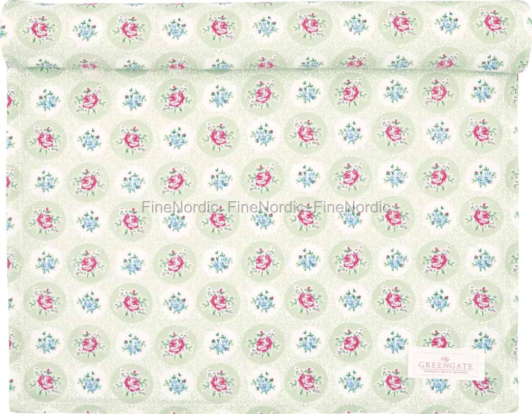 Låt ditt bord blomma upp med den milda charmen från bordslöparen Elle Pale Green. Detta vackra stycke från GreenGate fångar den stilla glädjen i en hemlig trädgård, med sina fina blomstermedaljonger mot en mjuk, rogivande grön bakgrund.