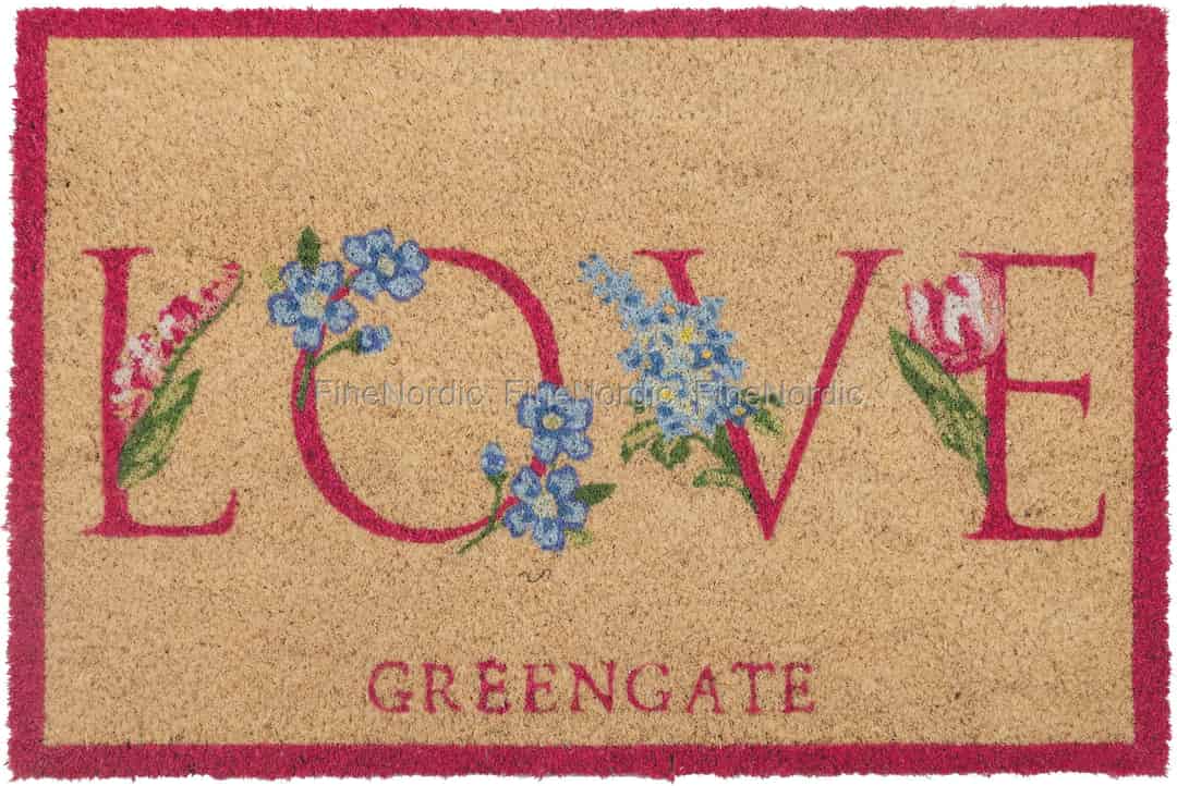 Låt det första steget in i ditt hem vara fyllt av glädje. Denna charmiga dörrmatta från GreenGate hälsar varje gäst välkommen med ett budskap om kärlek, vackert sammanflätat med illustrationer av klassiska trädgårdsblommor.
