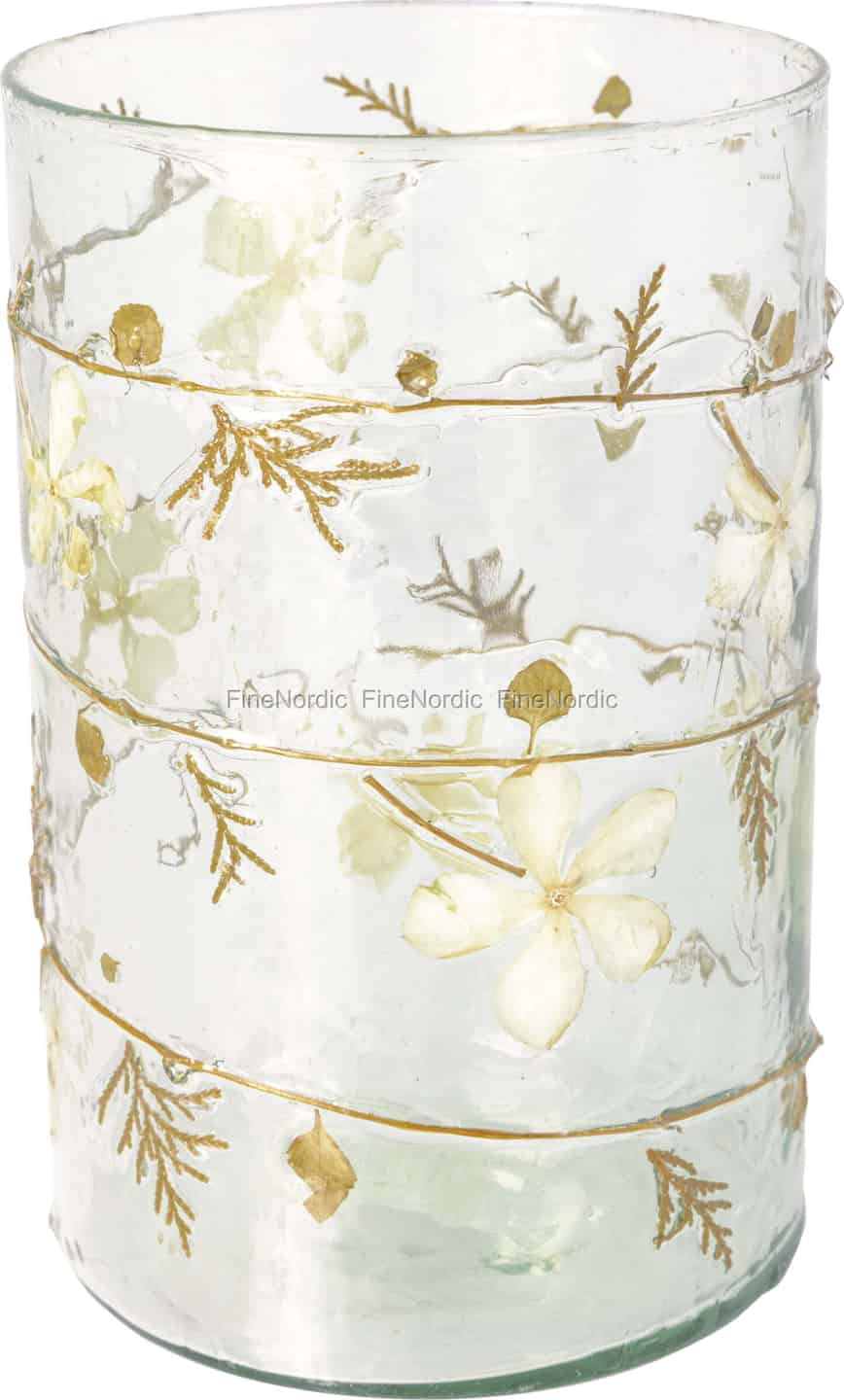 Föreställ dig det mjuka skenet från ett levande ljus som flimrar genom skira, pressade blommor. Denna vackra glas hurricane från GreenGate fångar den tidlösa charmen hos en vildvuxen sommaräng och bevarar dess spröda skönhet i texturerat glas, så att du kan njuta av den året runt.