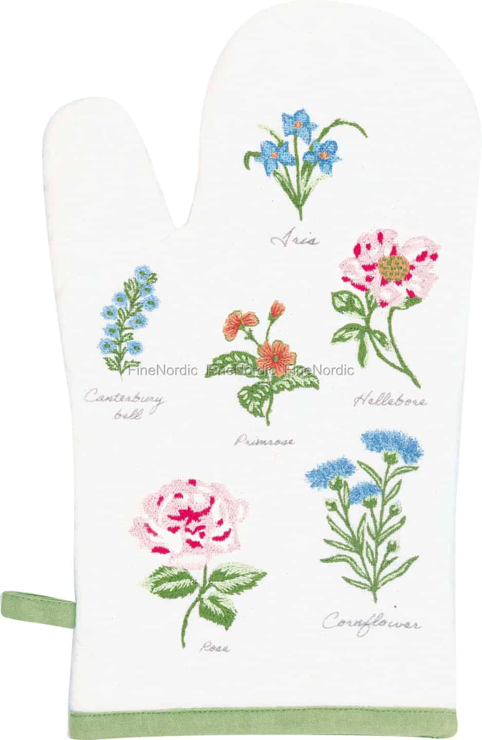 Föreställ dig att du tar in den lantliga trädgårdens milda skönhet i ditt hem. Denna charmiga grillhandske från GreenGate är prydd med ett fint botaniskt broderi, vilket förvandlar ett enkelt köksredskap till ett litet konstverk.