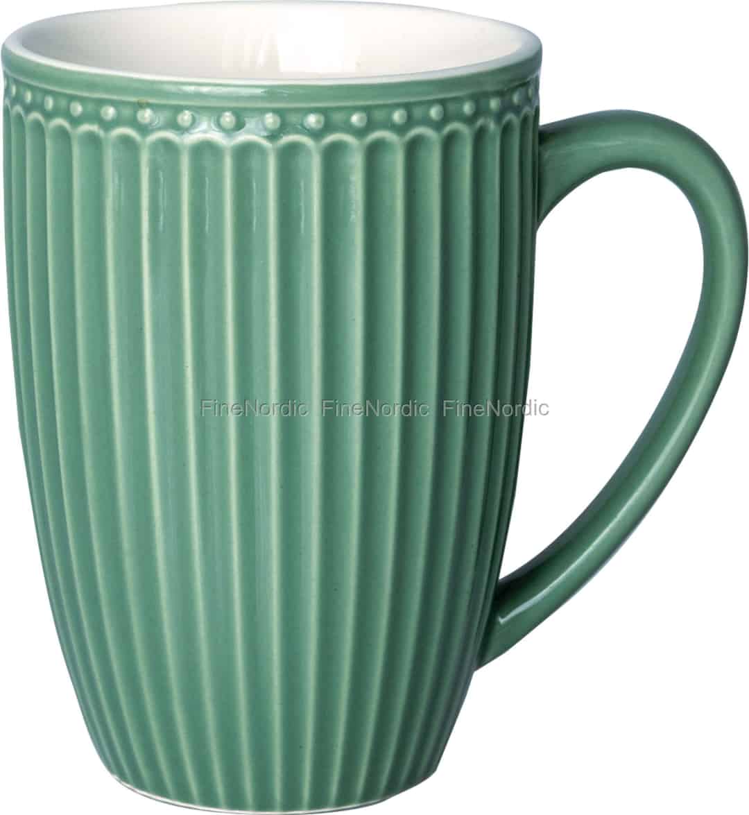 Alice-kollektionen från GreenGate fångar essensen av skandinavisk enkelhet, och denna höga mugg är ett perfekt exempel. Dess fridfulla, dammgröna glasyr påminner om de mjuka färgerna i ett nordiskt landskap, medan de karaktäristiska vertikala ränderna tillför en tidlös elegans. Detta är inte bara en mugg; det är en inbjudan att sakta ner, att finna en rofylld vrå och njuta av en stunds stillhet. Den kontrasterande krämfärgade insidan lyser upp din dryck och gör varje klunk speciell.