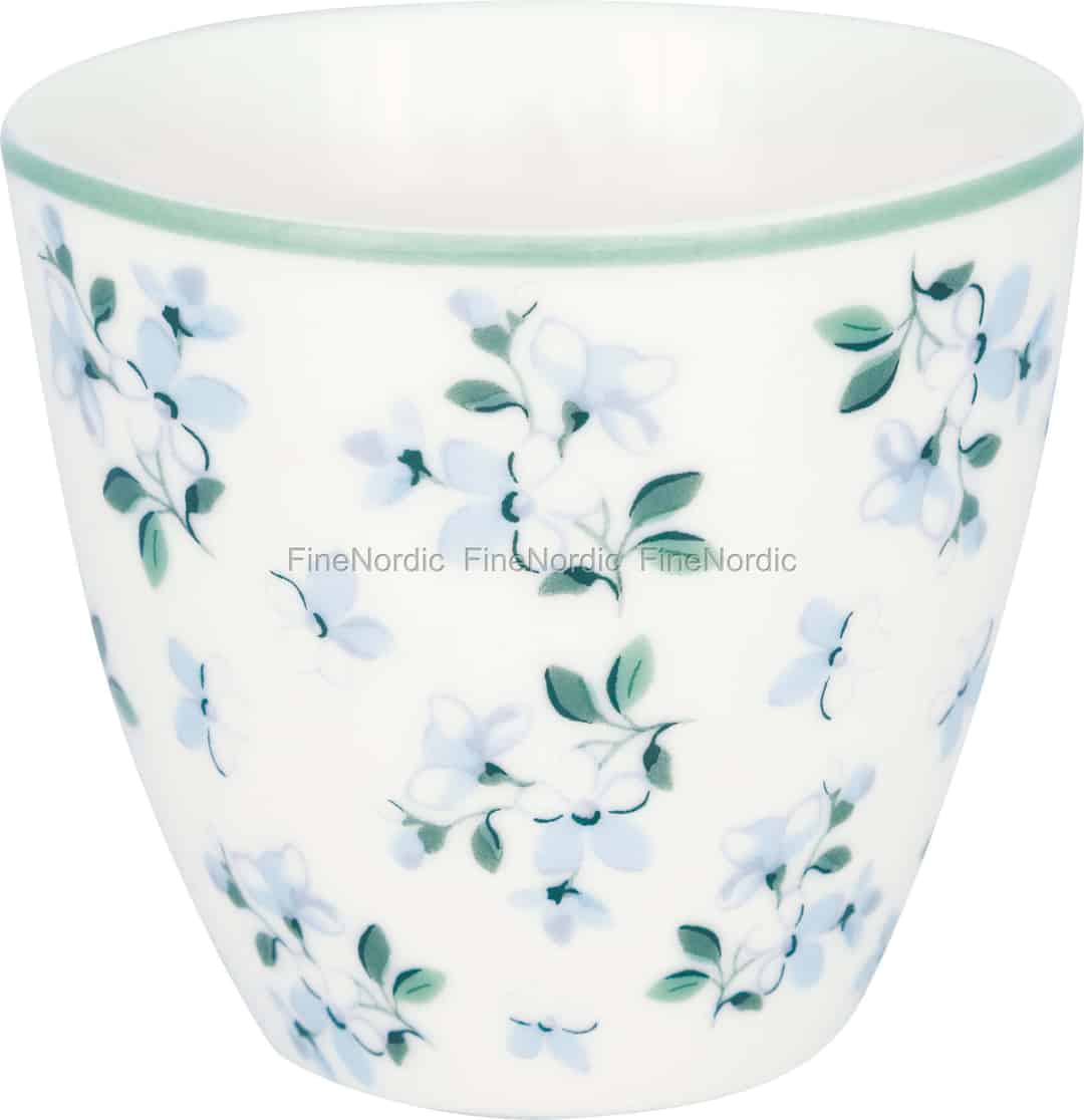 Kollektionen Alaia White från GreenGate fångar essensen av en fridfull skandinavisk morgon, när daggen ännu klamrar sig fast vid vildblommorna på en solbelyst äng. Varje kopp är som en målarduk för utspridda ljusblå blommor och mjuka gröna blad, som påminner om förgätmigej som dansar i en mild bris. Designen känns både tidlös och ny, och den för med sig en viskning av naturens stillhet till ditt köksbord. En enkel grön kant ger en charmig, rustik finish och fulländar berättelsen om genuin skönhet.