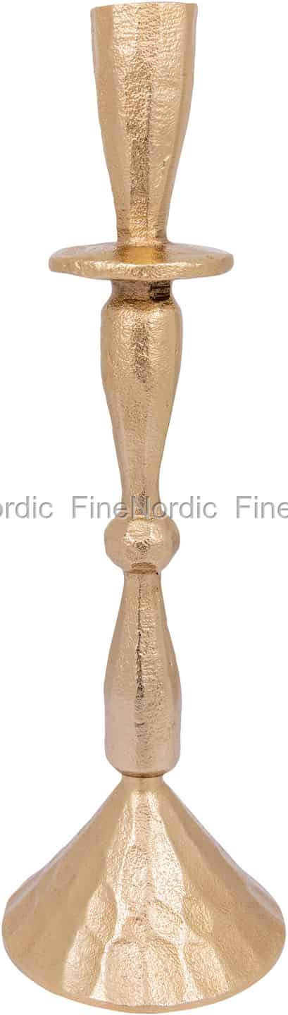 Föreställ dig den mjuka, fladdrande lågan från ett ljus som dansar över ljusstakens texturerade yta. Den hamrade guldfinishen fångar ljuset på ett vackert sätt, sprider ett varmt och inbjudande sken i rummet och skapar en stund av ren och skär mysighet.