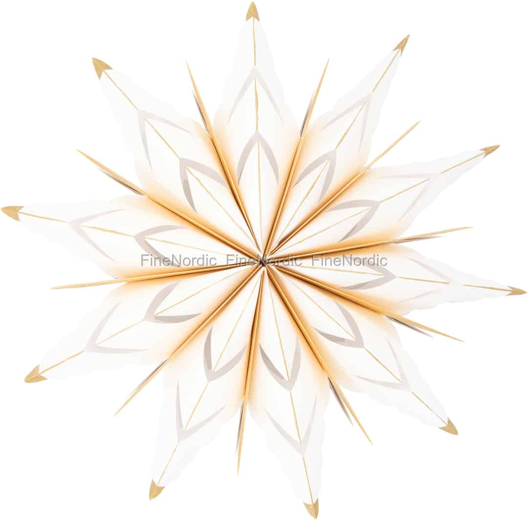 Inspirerad av den klara, stjärnfyllda himlen under en skandinavisk vinter är denna pappersstjärna från GreenGate ett mästerverk i juldesign. Varje spets och varje veck är omsorgsfullt utformat för att skapa en slående tredimensionell silhuett som tycks sväva i luften. Det krispigt vita pappret utgör en perfekt bakgrund för de varma, förgyllda accenterna som pryder dess form och fångar ljuset med ett mjukt, festligt skimmer. Det är en skapelse som talar om stilla firande och tidlös stil.