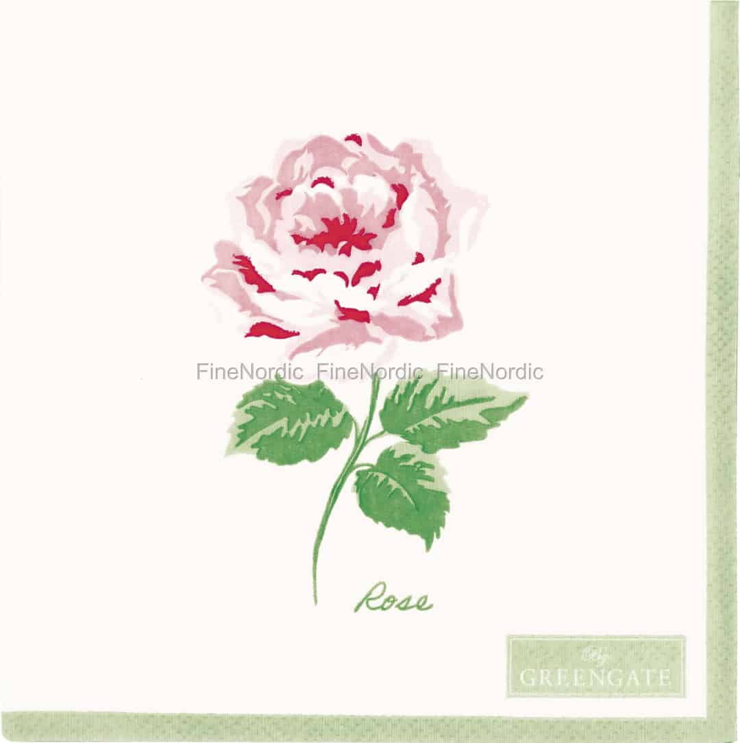 Agnes White-kollektionen från GreenGate är en kärleksförklaring till den tidlösa skönheten i en blommande trädgård. Varje servett är prydd med en enskild, skir ros, fångad i mjuka nyanser av rosa och karmosinrött med fräscha gröna blad. Designen känns som en sida ur en botanisk skissbok i vintagestil, placerad mot en krispigt vit bakgrund och inramad av en enkel, elegant grön bård. Det är en design som viskar om lugna eftermiddagar, varmt solsken och den enkla glädjen i naturens konstnärskap, och som bjuder in en känsla av lugn och grace till ditt hem.