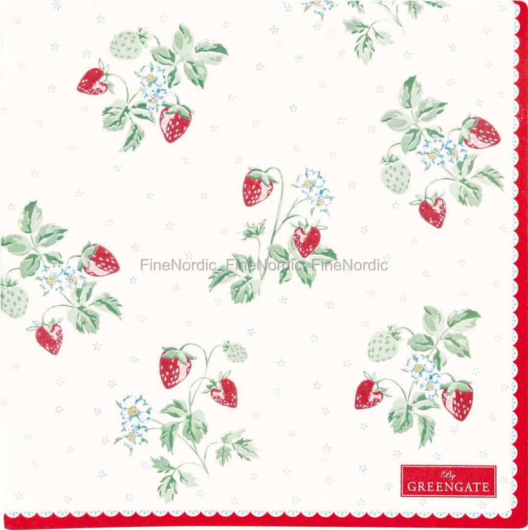 Inspirerad av den enkla glädjen i att plocka solmogna jordgubbar en varm eftermiddag, är Berry White-kollektionen från GreenGate en sann hyllning till sommaren. Varje servett berättar en historia om slingrande jordgubbsplantor, med sina livfulla röda bär, mjuka gröna blad och små, stjärnlika blommor utspridda mot en krämvit bakgrund. Designen har en tidlös, handtryckt kvalitet som känns både äkta och djupt charmig, och som omedelbart skapar en känsla av värme och nostalgi i ditt hem.