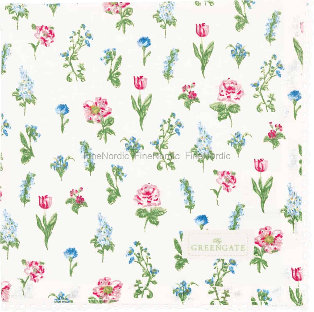 Låt servetten Estrid White förflytta dig till en solstänkt trädgårdsgång en tidig vårdag. GreenGate har fångat essensen av denna idylliska scen med ett mönster av skira tulpaner, rosor och förgätmigej i mjuka rosa och blå nyanser mot en krispigt vit bakgrund. Varje blomma tycks berätta en historia och väcker minnen av nyplockade buketter och lata eftermiddagar utomhus. Den mjuka, taktila kvaliteten hos bomullen känns underbar i händerna och gör varje måltid till en mer medveten och vacker stund.