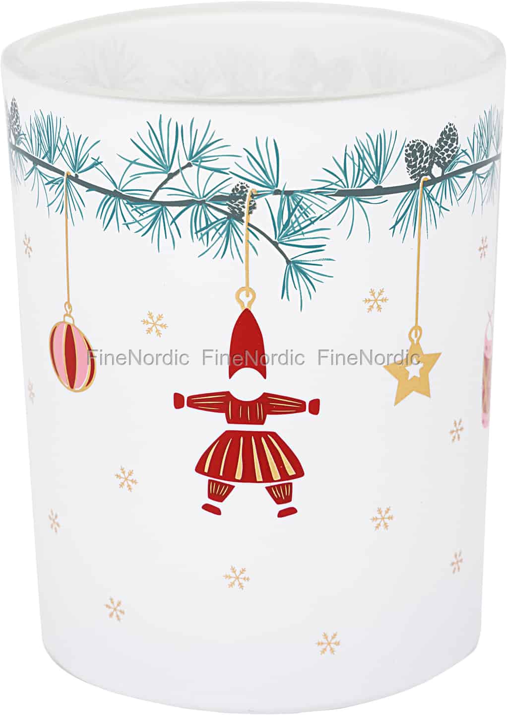 Upptäck den stilla magin i en skandinavisk vinter med värmeljushållaren Juana White från GreenGate. Varje detalj i det omslutande motivet berättar en festlig saga, från den glada röda tomten som dinglar från en grankvist till de fina guldflingorna som ser ut att sväva över det frostade glaset. Det är en design som fångar hjärtat av en traditionell nordisk jul och hyllar naturen, folktron och den enkla glädjen i ljus.