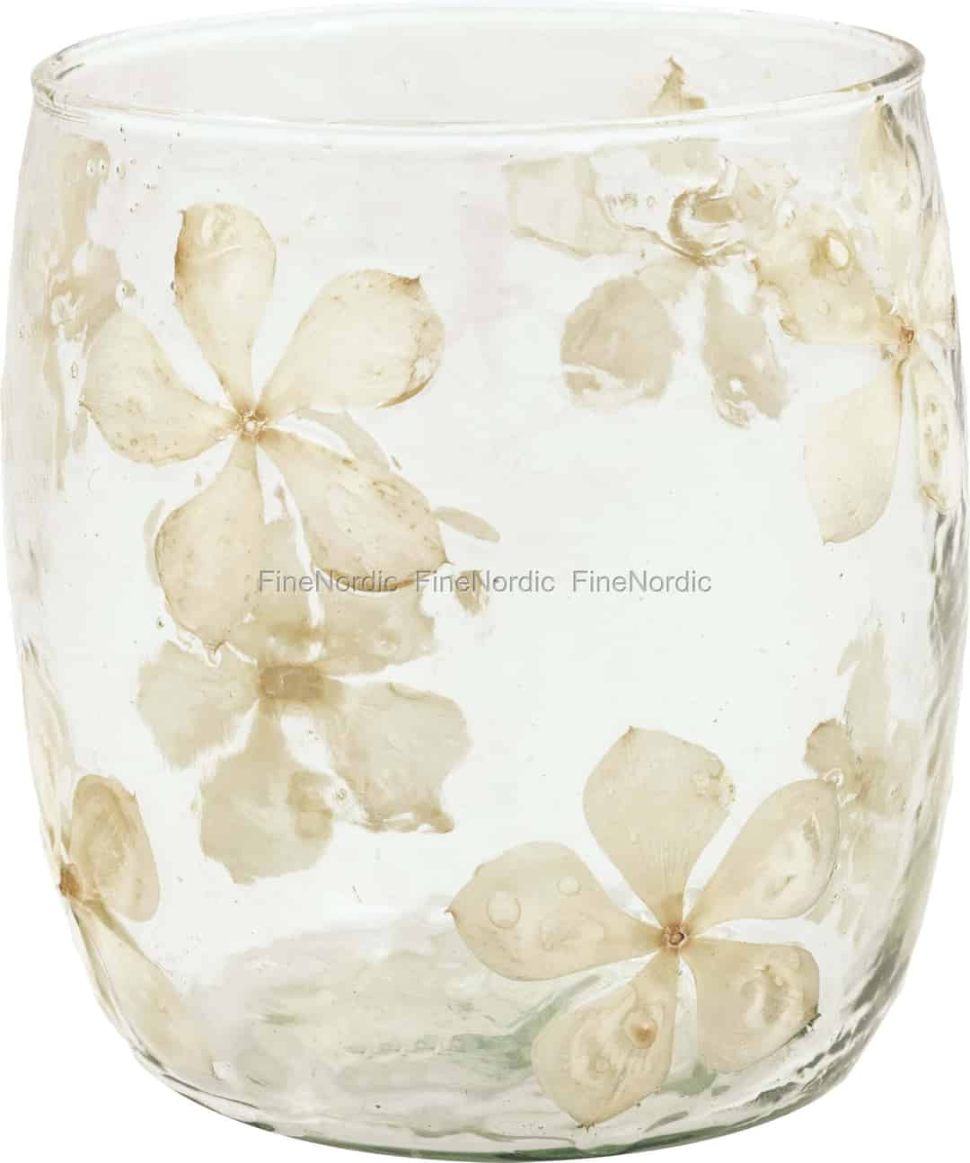 Denna värmeljushållare är mer än bara ett dekorativt föremål; den är ett fångat ögonblick av naturlig elegans. Var och en berättar en stilla historia, med skira, gräddvita blommor svävande inuti det mjukt välvda glaset, som om de bevarats från ett solkysst fält. Ljuset från ett enda värmeljus silar genom kronbladen, kastar intrikata, dansande skuggor och skapar en atmosfär av ren sinnesro. Ytan, med sina subtila ojämnheter och små, instängda luftbubblor, känns underbart autentisk i dina händer – ett bevis på dess omsorgsfulla, hantverksmässiga skapelse.