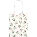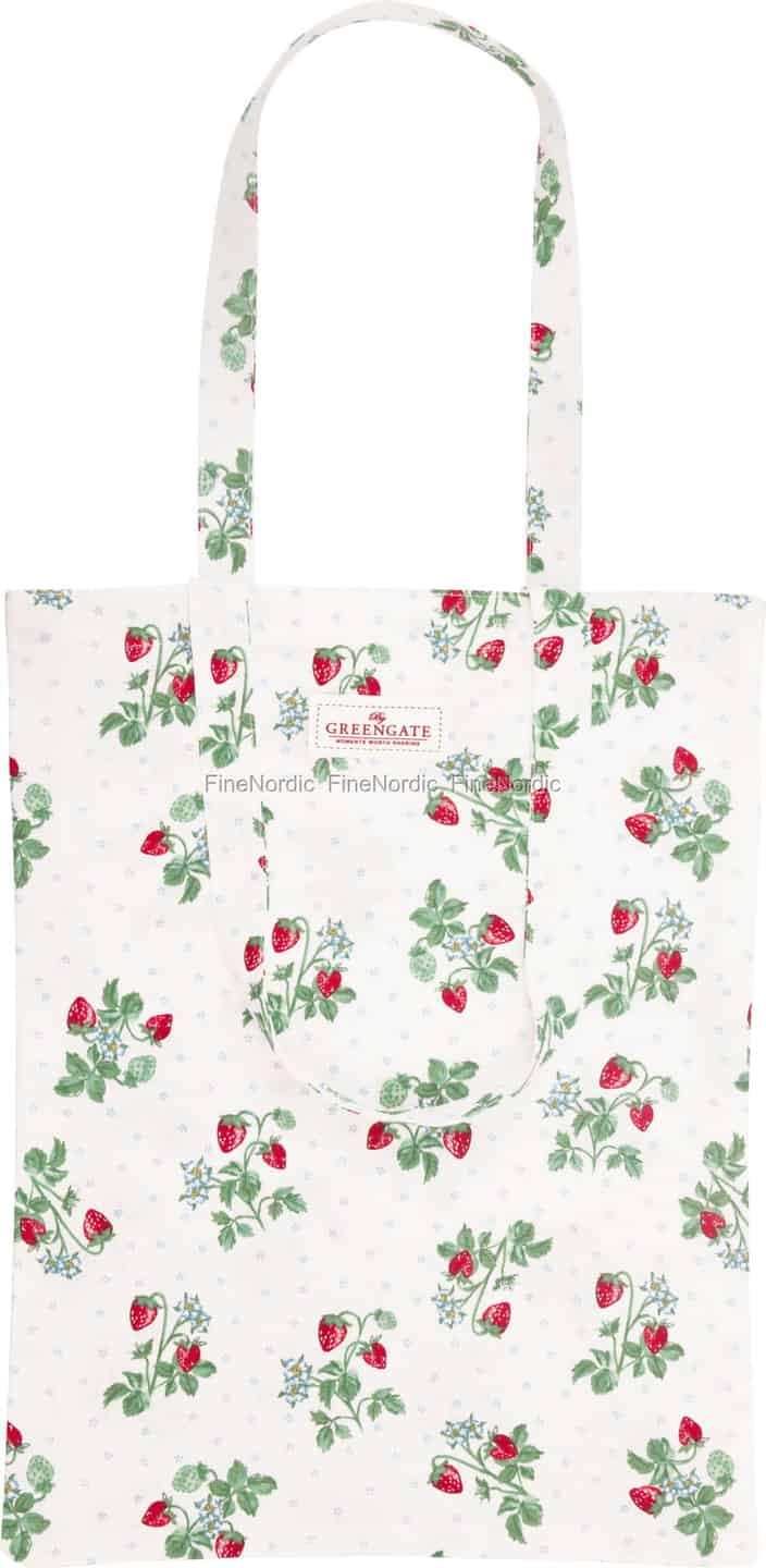 Föreställ dig en promenad genom en solbelyst trädgård, med korgen i handen. Denna charmiga tygväska från GreenGate fångar precis den känslan, med sitt ljuvliga mönster av söta jordgubbar och fina blommor spridda över krispig vit bomull.