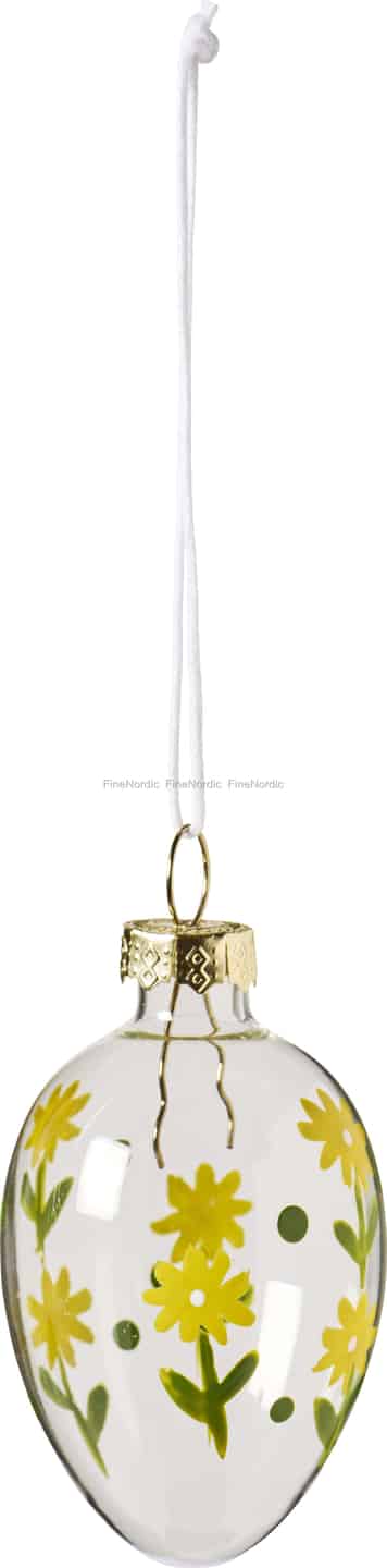 Bjud in vårens glädjefyllda anda i ditt hem med detta förtjusande glasägg från Ib Laursen. Dess transparenta yta är prydd med solgula blommor som fångar ljuset och löftet om ljusare tider. En sann viskning om den nya årstiden.