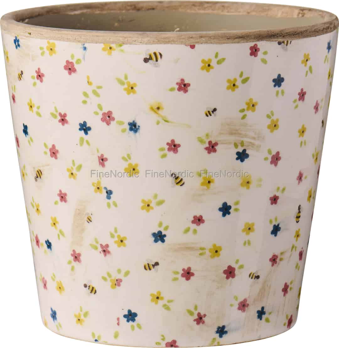 - Ett finurligt mönster inspirerat av sommarängen: Krukan är dekorerad med små, färggranna blommor och glada humlor, vilket ger ditt hem en lekfull, sagolik känsla och förvandlar varje växt till ett förtjusande blickfång.