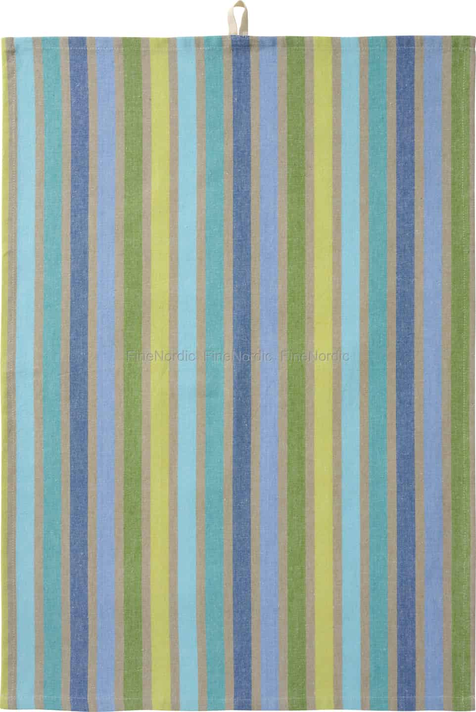 Föreställ dig hur det milda ljuset från en morgon vid havet fyller ditt kök. Denna vackra kökshandduk från Ib Laursen fångar just den känslan, med sina rogivande ränder i blått, grönt och sandigt beige, och tillför en enkel gnutta nordisk charm till dina vardagssysslor.
