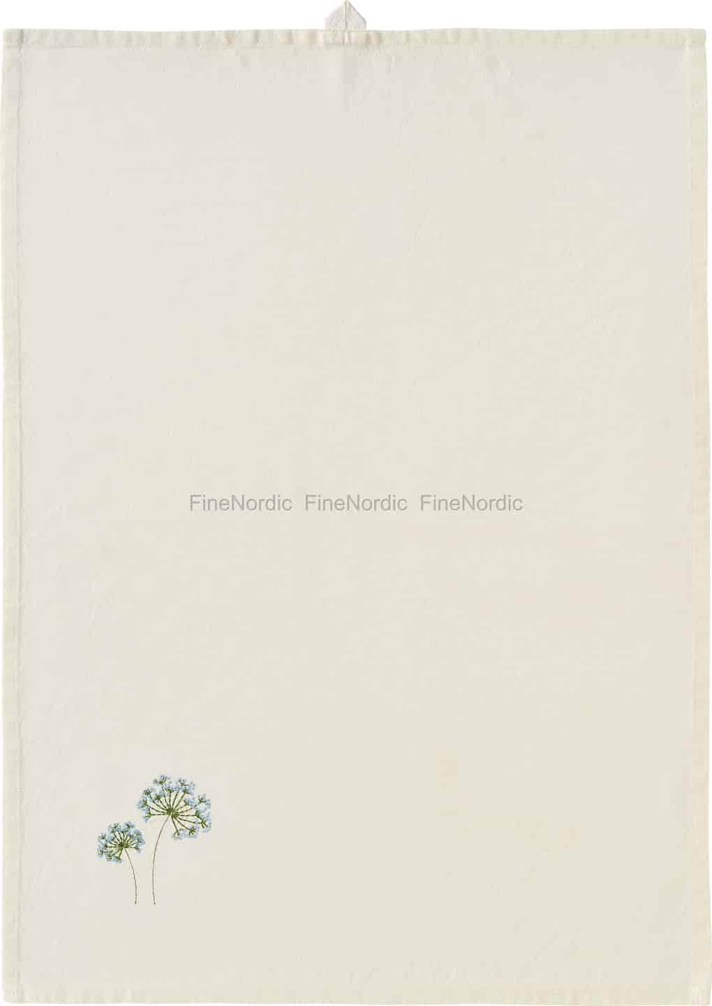 Introducera en stillsam skönhet i dina dagliga köksritualer med kökshandduken Flora. Dess mjuka, smörkrämsfärgade bomull pryds av ett fint broderi av en vild flockblomma, en varsam hyllning till de skandinaviska ängarna.