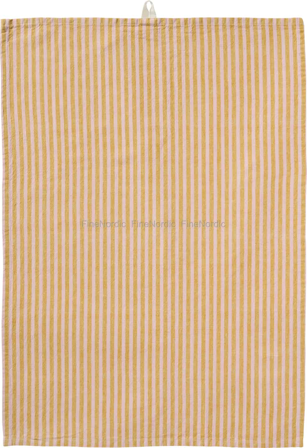 Från hjärtat av dansk design hyllar Ib Laursens Linea-kollektion den stillsamma skönheten i vardagens nödvändigheter. Denna ljuvliga kökshandduk förkroppsligar den filosofin, med ett tidlöst randigt mönster som känns både nostalgiskt och nytt. Kombinationen av varm senapsgul och skir ljusrosa framkallar bilder av en lantlig trädgård i full blom, och skänker en känsla av lugn och belåtenhet till hemmets hjärta. Det är ett enkelt sätt att introducera färg och personlighet i ditt rum.
