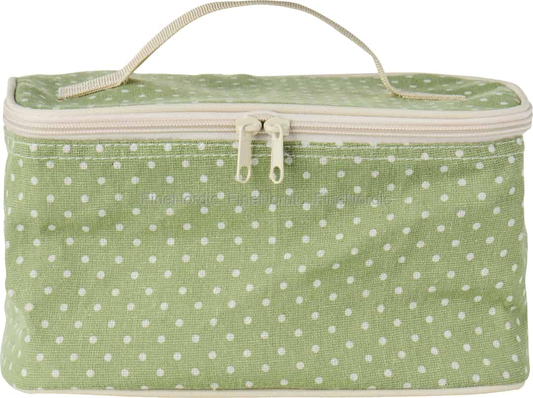 Omfamna den enkla glädjen i att äta utomhus med denna underbara kylväska från Ib Laursen. Dess milda gröna nyans och lekfulla prickiga mönster fångar essensen av en bekymmersfri sommardag och förvandlar en vanlig lunchrast till en förtjusande flykt. Tillverkad av mjuk bomull är den inte bara en praktisk väska utan också en vacker accessoar som talar om en kärlek till genomtänkt, rustik design. De krämfärgade kantbanden, dragkedjan och handtaget tillför en touch av diskret elegans, vilket gör den till en fantastisk följeslagare på alla resor.