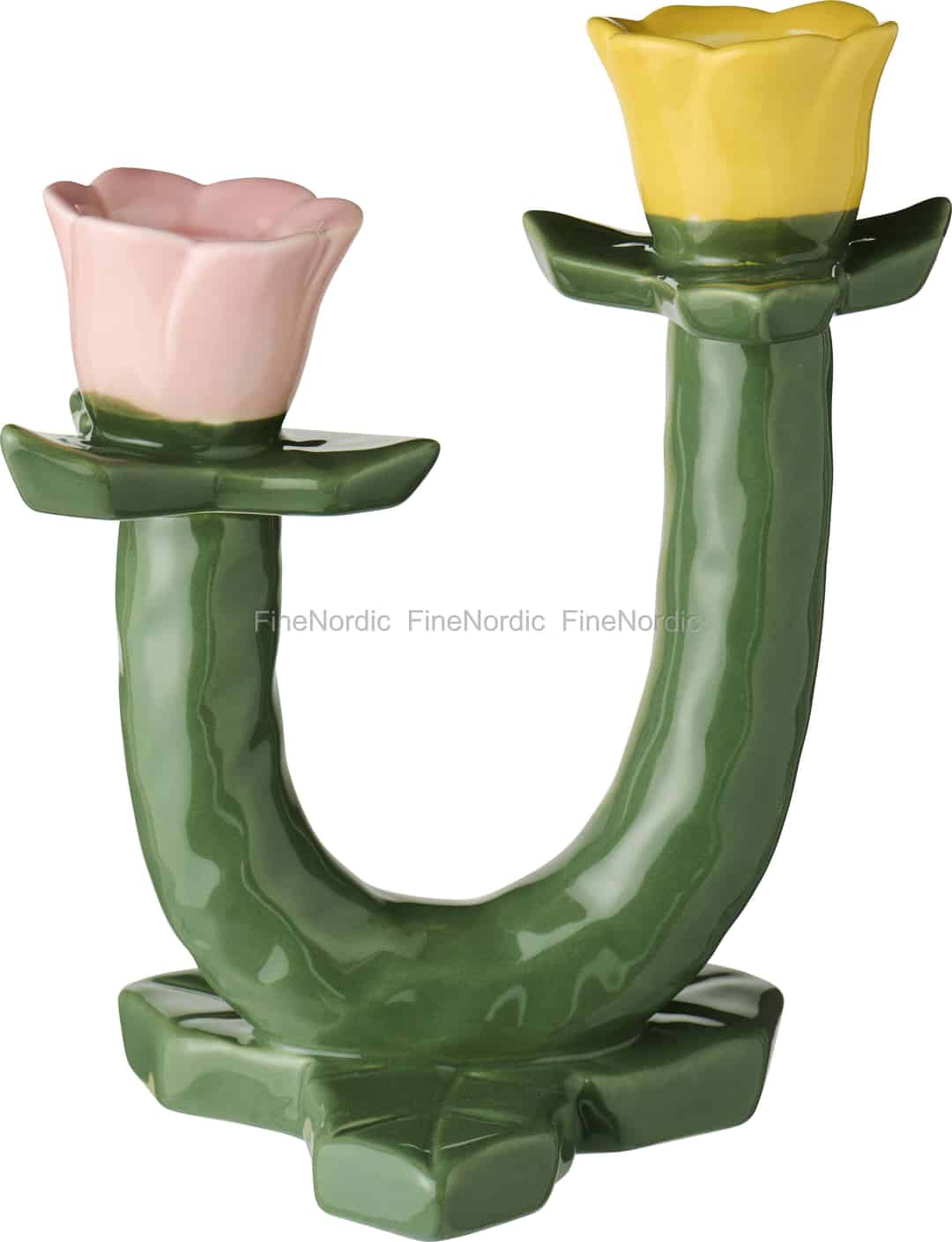 Återupptäck den enkla glädjen i en trädgård i full blom med denna underbart fantasifulla ljusstake från Ib Laursen. Dess skulpturala form, som påminner om en stolt tulpanstjälk, tillför en organisk och lekfull energi till ditt hem. Den glansiga gröna keramiken fångar ljuset vackert och utgör en livfull bas för de två skira blomsterkopparna – en i rodnande rosa, den andra i glatt gult – som väntar på att få hålla dina favoritkronljus. Det är en pjäs som berättar en historia om nystart och soliga eftermiddagar.