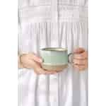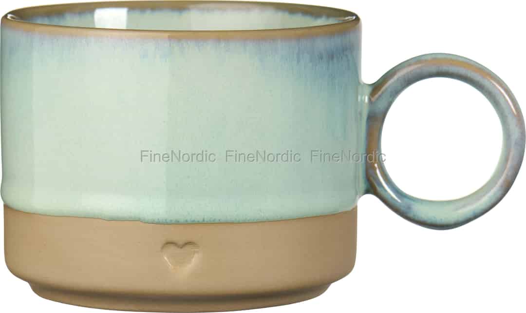 Från det välkända danska varumärket Ib Laursen kommer denna mugg som är en hyllning till den enkla, vardagliga skönheten. Designen blandar omsorgsfullt två distinkta texturer: en sval, slät keramikglasyr i en rogivande ljusgrön nyans, och en oglaserad, jordnära bas som känns underbart grundande att hålla i. Magin ligger i detaljerna – den reaktiva glasyren som flyter längs kanten och skapar unika färgmönster, och det diskret präglade hjärtat som fungerar som en stilla påminnelse om att njuta av stunden.