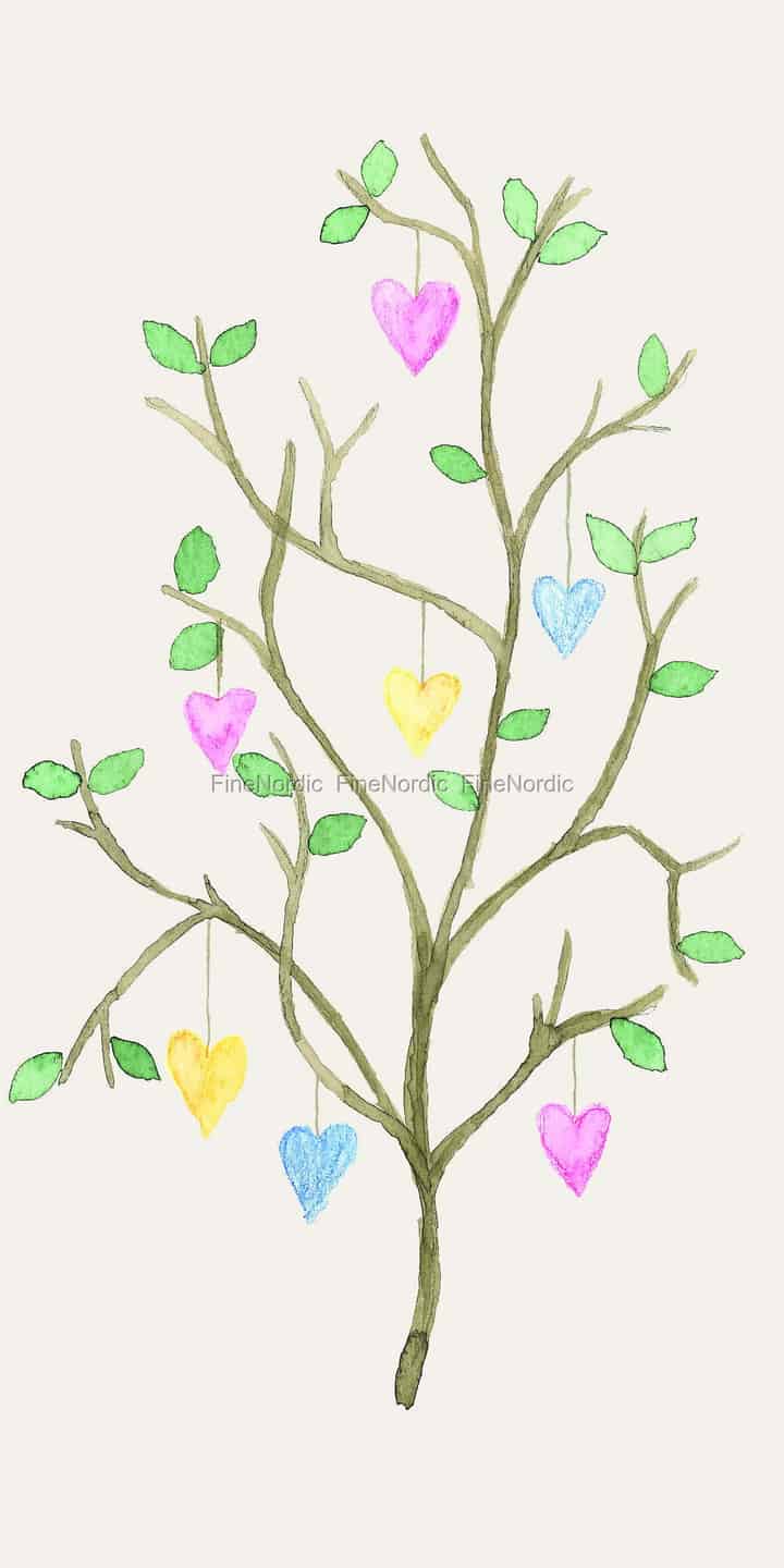 Fira den nya börjans årstid med denna förtrollande design från Ib Laursen. Servetten Vårgren är mer än bara ett bordstillbehör; det är ett litet konstverk som berättar en historia om värme och ömhet. Den delikata akvarellillustrationen fångar vårens hoppfulla essens, med fräscha gröna blad som spirar från skira grenar. Istället för blommor hänger små hjärtan i mjuka nyanser av rosa, gult och blått som dyrbara prydnader och skapar en känsla av ren, enkel glädje.