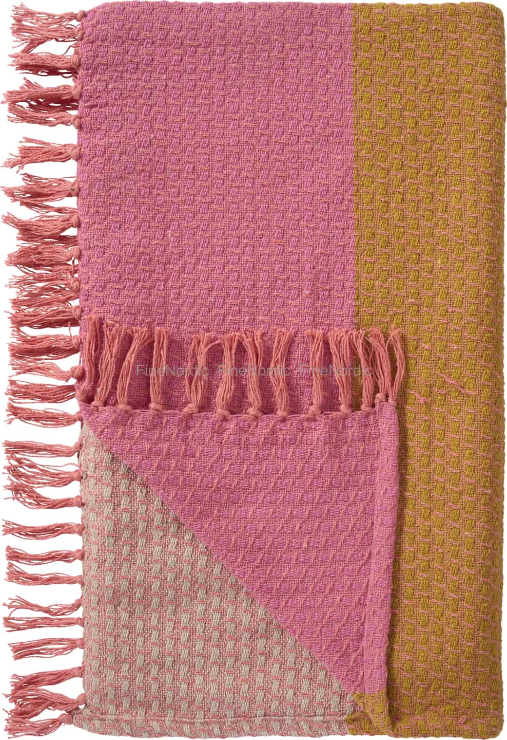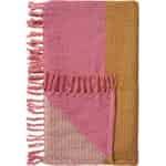 Föreställ dig det mjuka skenet från en nedgående sol, fångat i vävd bomull. Denna vackra pläd från Ib Laursen skänker en mild värme till varje rum, med sin inbjudande textur och en palett av puderrosa, varm senapsgul och naturliga toner.