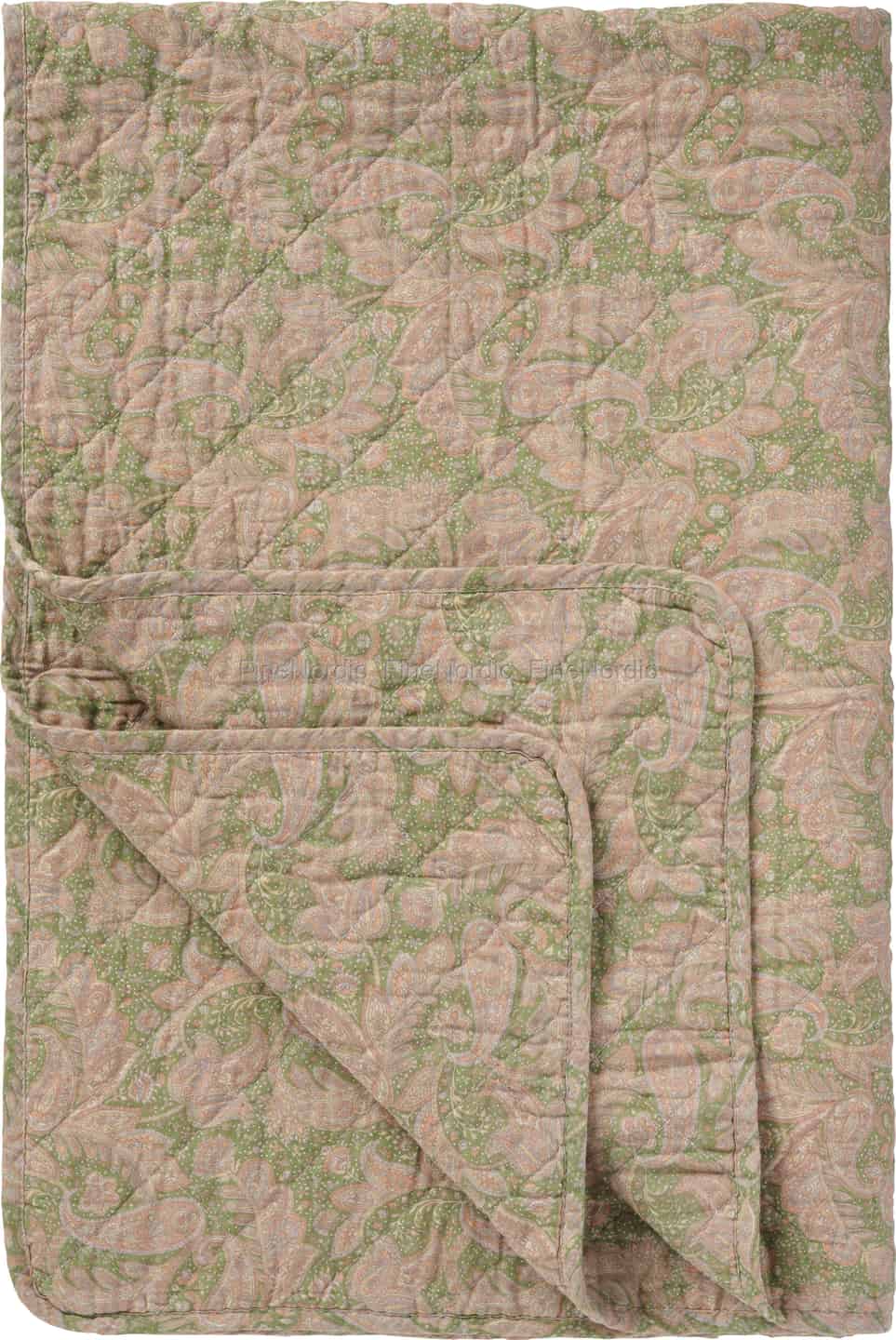 Föreställ dig att du sveper denna vackra quilt över din favoritfåtölj, där dess mjuka bomull blir en välkommen tröst en kylig kväll. Det milda paisleymönstret, i dämpade toner av grönt och puderrosa, tillför en känsla av tidlös elegans till dina lugna stunder.