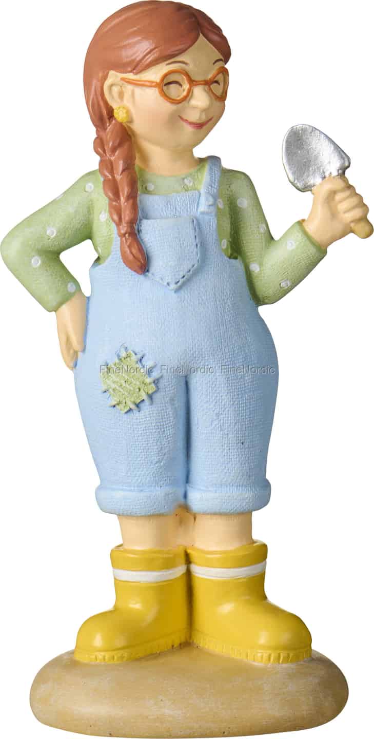 Från Ib Laursens kollektion förkroppsligar denna ljuvliga trädgårdsmästare andan av ett liv i harmoni med naturen. Lägg märke till de omtänksamma detaljerna som ger henne så mycket personlighet: den prydliga flätan i håret, den glada prickiga skjortan och den lilla lagade lappen på hängselbyxorna – ett tecken på många glädjefyllda timmar med händerna i jorden. Hennes klargula gummistövlar är redo för alla väder, och den trogna spaden i hennes hand antyder att hon just har stannat upp för att beundra sitt verk.