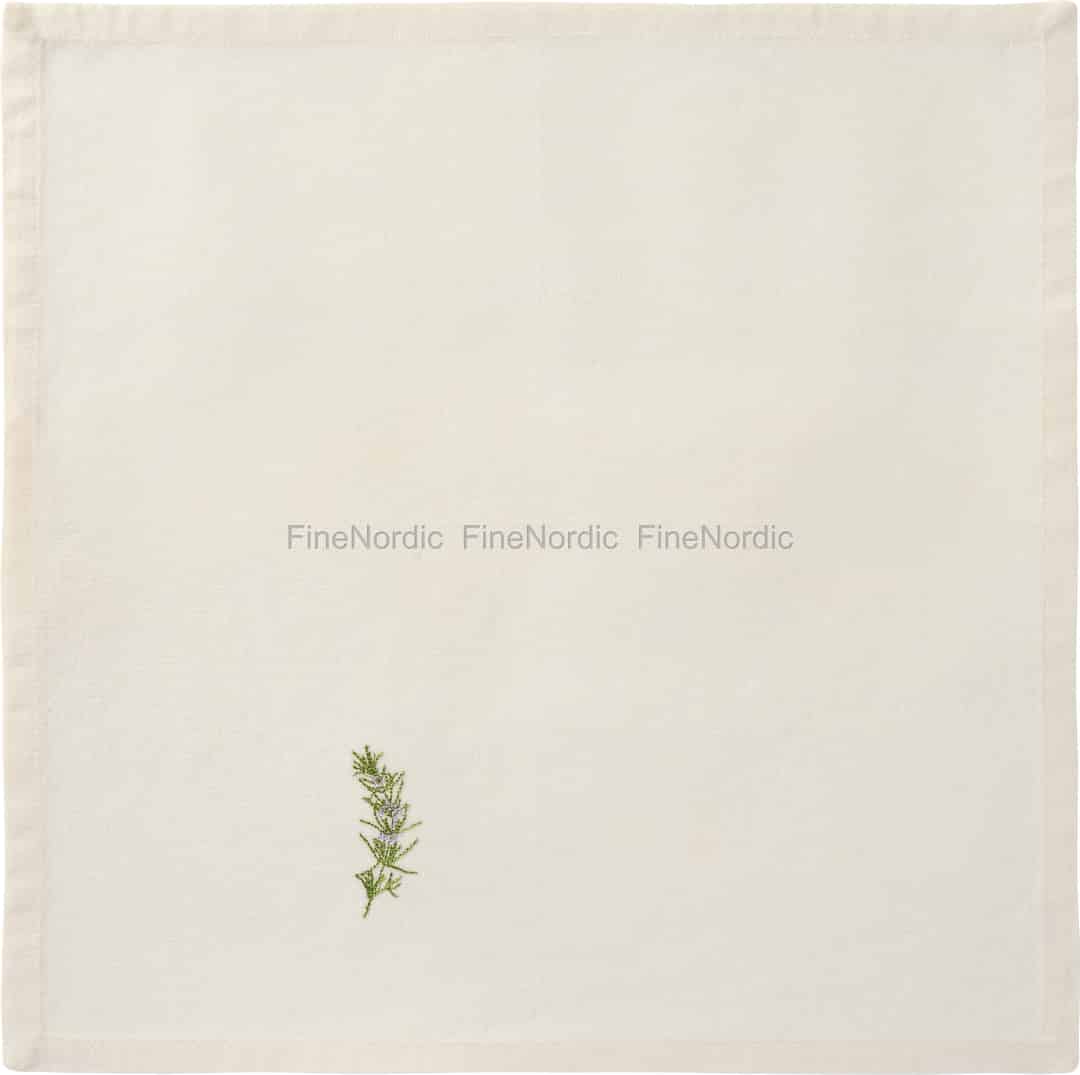 Föreställ dig ett bord dukat i en solstänkt trädgård, där luften fylls av den milda doften av örter. Denna vackra, smörkrämsfärgade servett från Ib Laursen, med sin fint broderade rosmarinkvist, fångar precis den känslan av avkopplande sommarsammankomster.