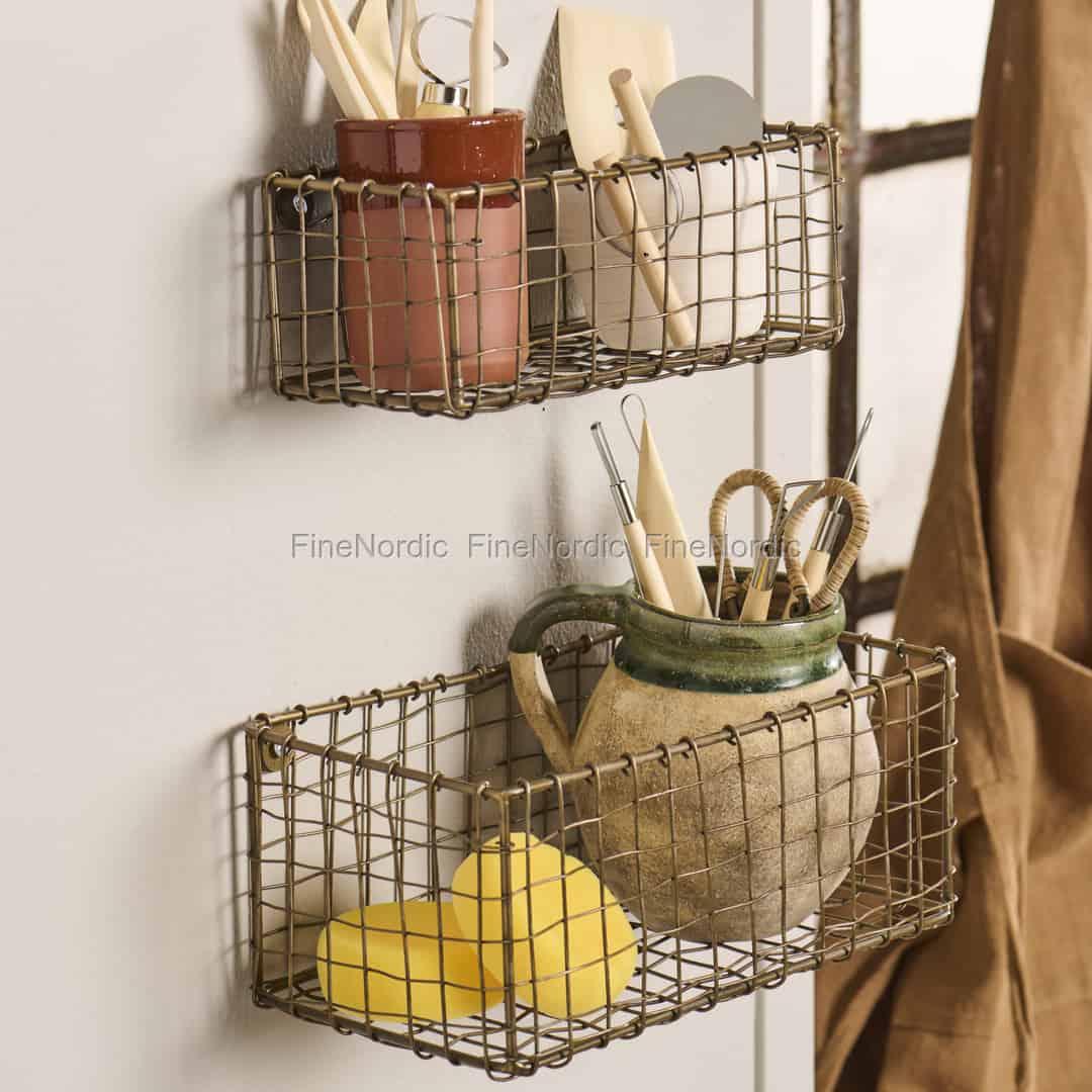 Från hjärtat av dansk design presenterar Ib Laursen en enkel lösning för att skapa harmoni och stil i ditt hem. Detta set med två trådkorgar förkroppsligar den nordiska övertygelsen att praktiska föremål också ska vara vackra. Metallen har en vacker, antikbehandlad guldfinish som ger en mjuk värme och en antydan av vintagekaraktär till vilken vägg som helst. Deras öppna tråddesign håller allt synligt och lättillgängligt, och förvandlar vardagliga nödvändigheter till en omsorgsfullt utvald uppvisning. Det är den typen av organisering som känns mindre som en plikt och mer som en handling för att skapa lugn.