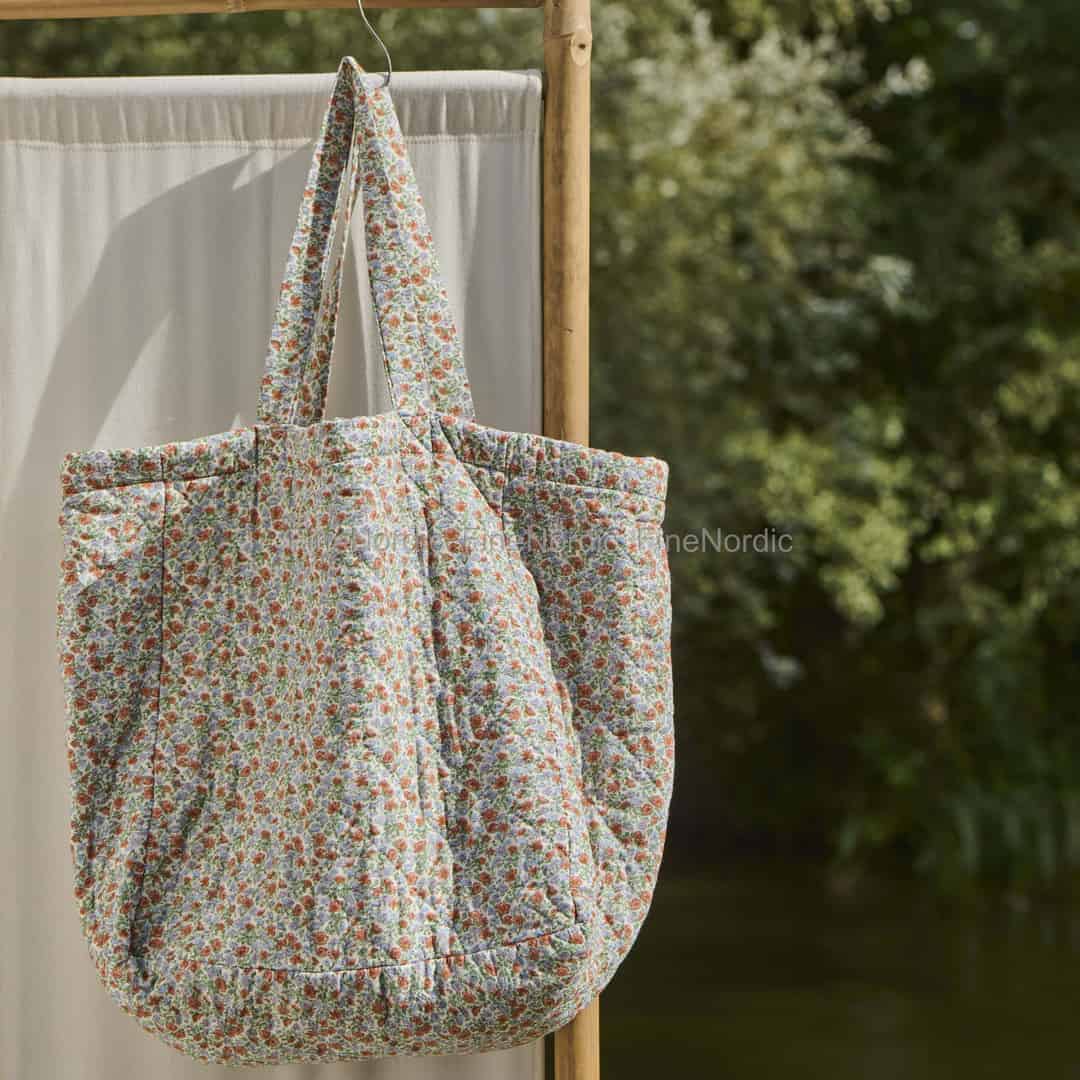 Inspirerad av den stilla skönheten i en skandinavisk lantträdgård är denna quiltade väska från Ib Laursen ett bevis på enkel, innerlig design. Det mjuka bomullstyget är prytt med ett finblommigt mönster där skira ljusblå och varmt rostfärgade blommor sprider sig över en krämfärgad bakgrund, vilket skapar en scen av tidlös ro. Diamantquiltningen tillför inte bara en vacker visuell textur utan ger också väskan en mjuk och behaglig känsla som gör att du vill bära den med dig överallt.