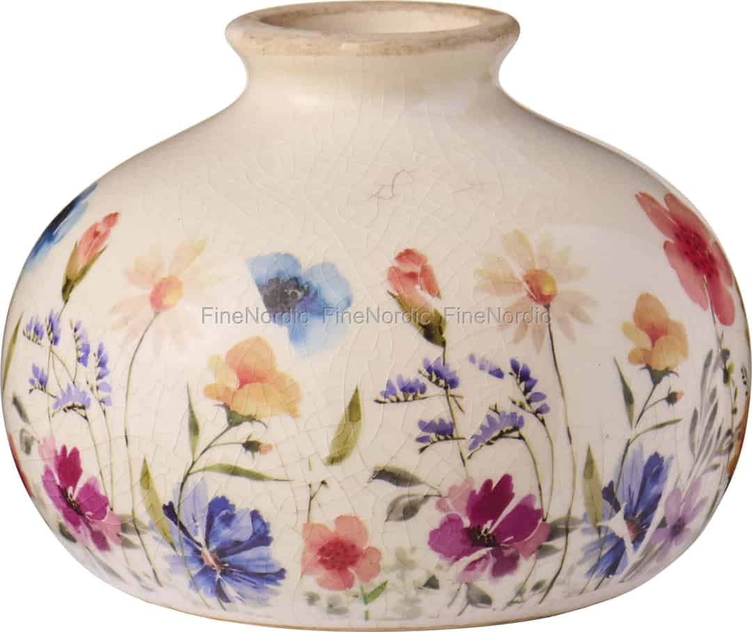 Låt den milda charmen från en solstänkt äng blomma ut i ditt hem med denna utsökta vas från Ib Laursen. Varje skir blomma, från de djupblå blåklinten till de ljuvt rosa vallmorna, är återgiven i en vacker akvarellstil som skapar en scen som känns både levande och fridfull. Den rundade keramikformen utgör den perfekta duken för denna hyllning till naturen, medan den intrikata krackelerade glasyren tillför ett lager av djup och nostalgisk karaktär. Det är mer än bara en behållare för blommor; det är ett litet konstverk som berättar en historia om slingrande lantliga trädgårdar och stilla, enkla stunder.