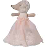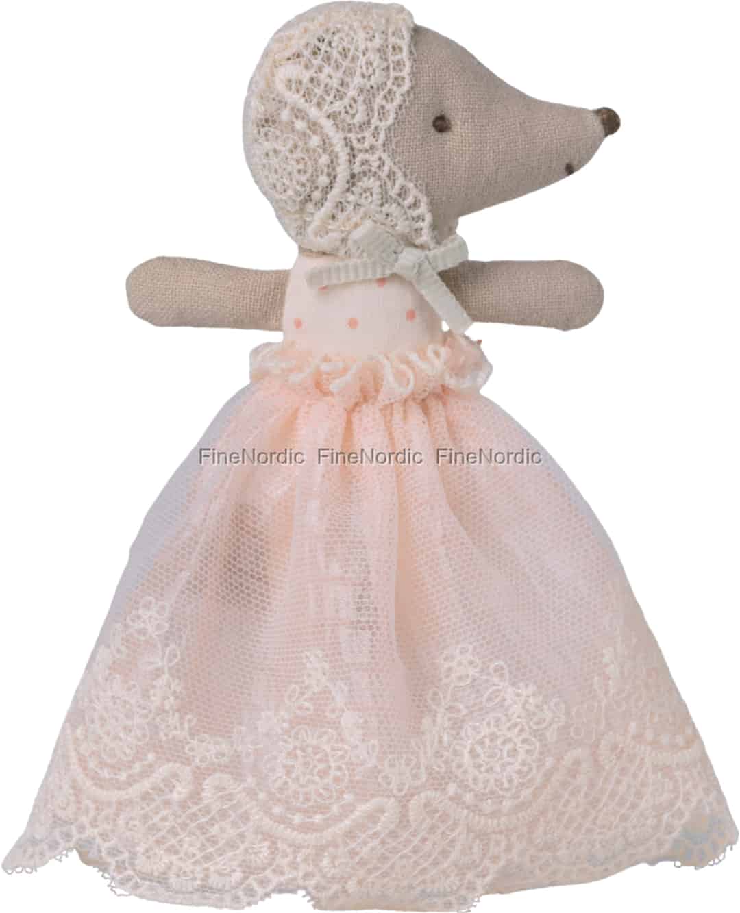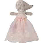 I Mailegs magiska värld har även de minsta karaktärerna de största historierna att berätta. Denna söta babymus är ett perfekt exempel, med sin mjuka textilkropp och sitt rara uttryck. Hon kommer klädd för ett speciellt tillfälle i en bedårande puderrosa klänning, med ett prickigt livstycke och en skir kjol prydd med intrikat blomsterspets. Hennes spetsmössa i vintagestil, prydligt knuten med ett mjukt band, ramar in hennes ansikte och gör henne redo för vilken kunglig tillställning eller mysig kramstund du kan tänka dig.