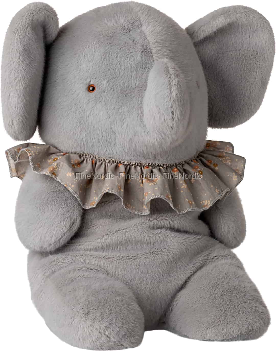 Från Mailegs magiska värld kommer en vän vars hjärta är lika stort som dess slokande öron. Denna stora elefant är en bild av mild charm, från sin mjuka, blågrå plyschpäls till sitt söta, eftertänksamma uttryck. Den är designad för att vara mer än bara en leksak; den är en förtrogen för viskade hemligheter och en stadig närvaro vid vilostunden. Dess tyngd i botten gör att den kan sitta tålmodigt på en hylla i barnkammaren eller vid fotändan av sängen, alltid redo för nästa äventyr.