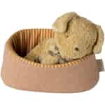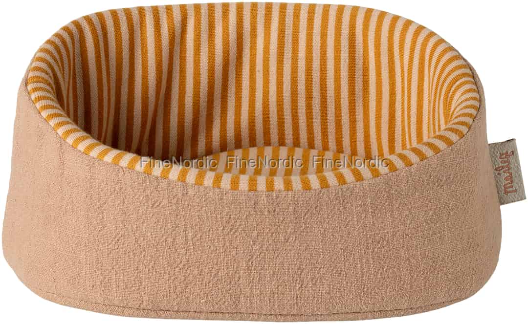 Korgen är tillverkad med den karaktäristiska charm som Maileg är känt för, och dess stadiga, puderbeige utsida har en underbar, taktil känsla. Inuti skapar det varma, senapsrandiga fodret en glad och inbjudande plats. Den ikoniska Maileg-etiketten på sidan är ett tyst löfte om kvalitet och autentisk design, vilket garanterar att denna lilla säng kommer att vara en bakgrund för otaliga glada minnen i många år framöver.