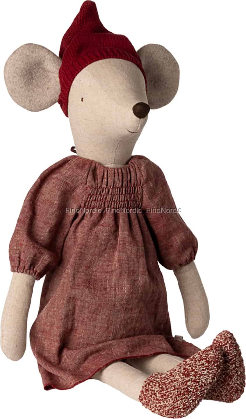 Möt den nyaste medlemmen i Maileg-familjen, en vän vars hjärta är lika stort som hennes charmerande maxistorlek. Klädd för fest i en dovt röd klänning med smock och en mysig stickad luva, bär hon med sig den stilla glädjen och magin från en skandinavisk jul. Hennes mjuka, tjocka öron är perfekta för att lyssna på viskade hemligheter och julönskningar, medan hennes milda leende lovar oändliga äventyr. Hon är en följeslagare för att skapa minnen, från att klä granen till att krypa upp med en sagobok en kall vinterkväll.