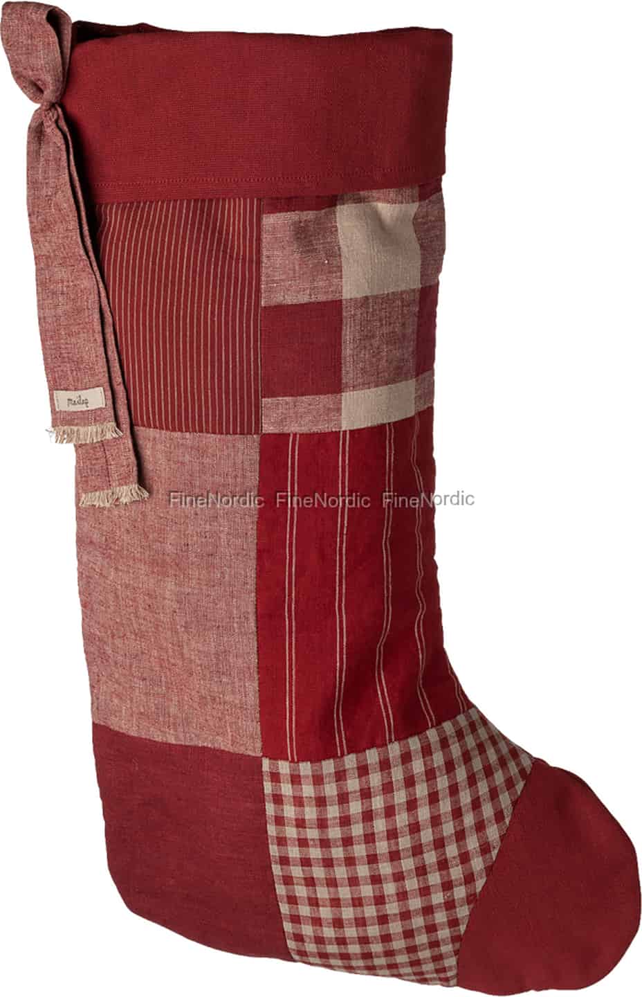 Föreställ dig hur det mjuka skenet från ljusslingor reflekteras i de varierade texturerna på denna förtjusande julstrumpa. Skapad av Maileg, väcker dess charmiga lapptäckesdesign en känsla av tidlös tradition, redo att fyllas med julens under.