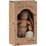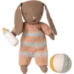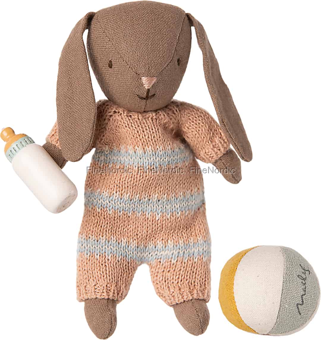 Föreställ dig den stilla glädjen när din lilla skatt möter sin nya bästa vän. Denna lilla Maileg-kanin, klädd i den mjukaste randiga sparkdräkten, är redo för en dag fylld av stillsam lek, komplett med sin alldeles egna flaska och boll.