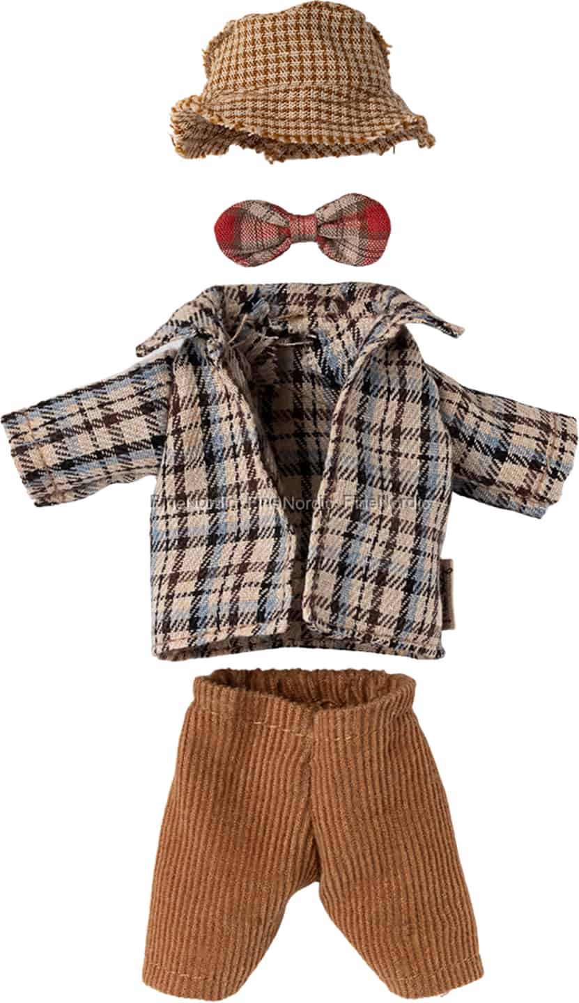 Förbered din kära Maileg-mus för ett nytt kapitel i livet med denna utsökt detaljerade morfarsklädsel. Den stiliga, rutiga jackan med sina diskreta inslag av blått passar vackert ihop med de rejäla bruna manchesterbyxorna och skapar en look av tidlös, lantlig charm. För att fullända hans förnäma utseende tillför en liten, elegant fluga en färgklick, medan hatten i hundtandsmönster med sin fransade kant ger en air av mild visdom.