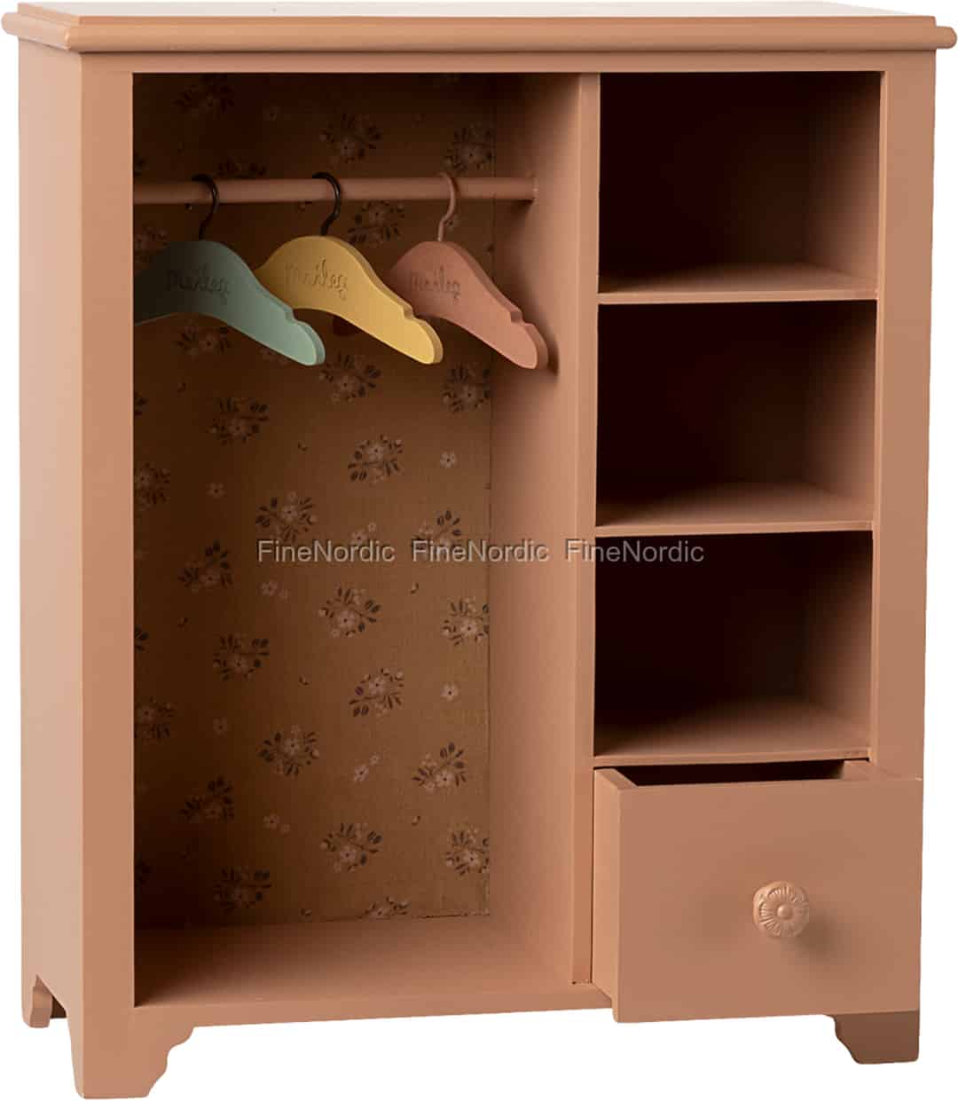 Öppna dörren till en värld av fantasi med detta förtrollande klädskåp från Maileg. Målat i en tidlös, mörk pudernyans, ger dess klassiska design en touch av skandinavisk charm till varje barns utrymme. Inuti väntar en härlig överraskning: ett vintageinspirerat blommigt papper klär baksidan och skapar ett vackert hem för de allra minsta kläderna. Ditt barn kommer att älska att arrangera kläder på de tre medföljande galgarna, ställa undan små skor på hyllorna och gömma hemliga skatter i den lilla lådan med sin fina blomformade knopp.