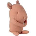 Möt Lullaby-grisen, en liten vän med ett stort hjärta, designad av Maileg för att inspirera till de allra finaste sagorna. Denna söta lilla gris, med sitt dovt rosa tyg och öron fodrade med glada prickar, är mer än bara en leksak; den är en drömväktare och en följeslagare i stilla stunder. Dess enkla, broderade ögon och mjuka form är en inbjudan till ditt barn att skapa en fantasivärld där vänskap börjar med en mjuk kram och ett viskat godnatt.