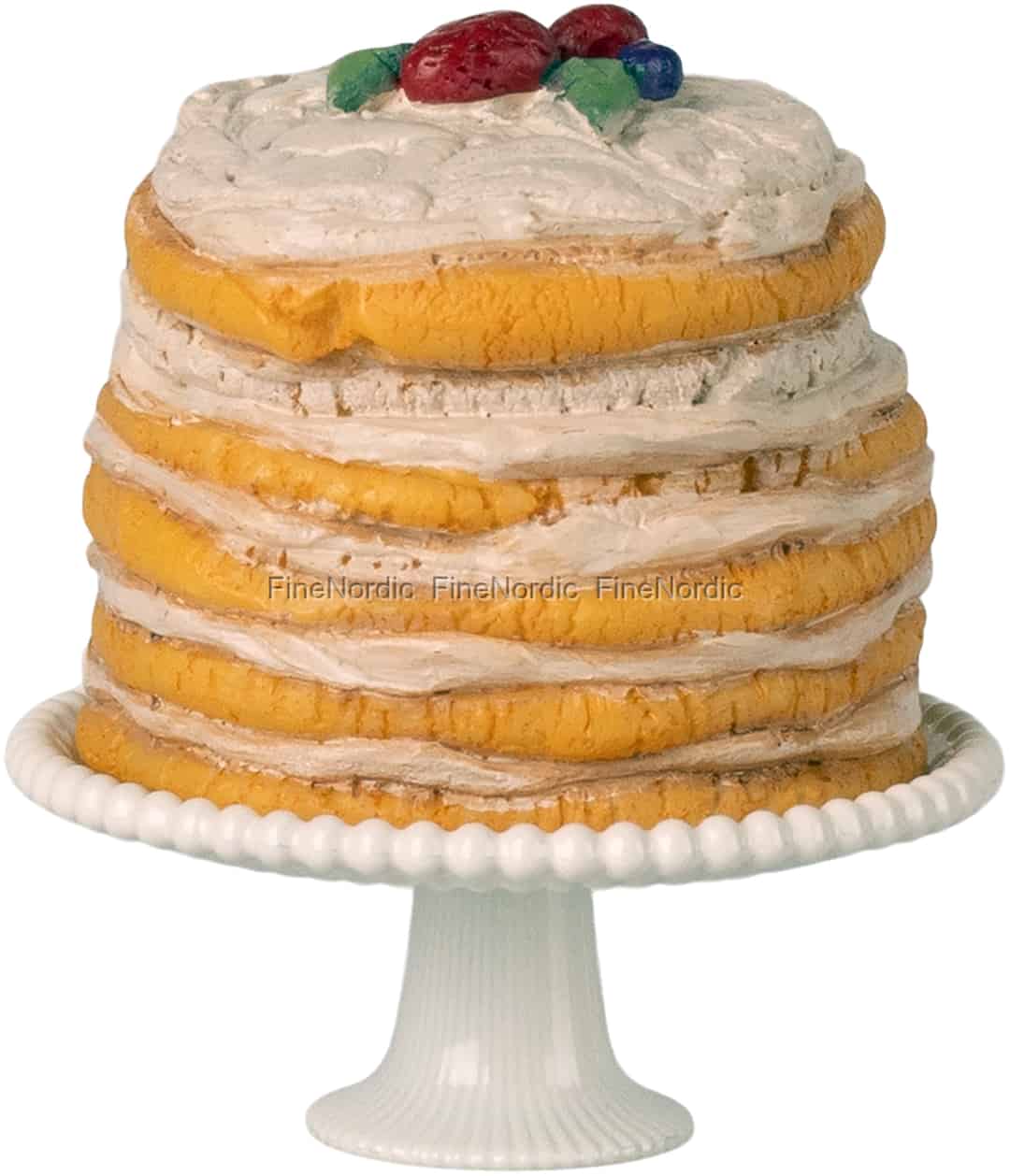 Varje speciellt ögonblick förtjänar ett firande, oavsett hur litet det är. Denna ljuvliga miniatyr-festtårta från Maileg skänker en känsla av högtid till din älskade samling. Lagren av gyllene tårtbotten och delikat off-white glasyr har en underbart rustik, hembakad känsla, krönt med söta små bär. Den vilar stolt på ett klassiskt off-white tårtfat, komplett med en pärlkant och räfflad fot, redo att bli höjdpunkten på alla sammankomster i musstorlek, från födelsedagar till eftermiddagste.