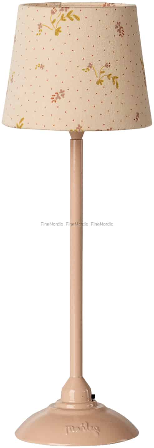 Föreställ dig din Maileg-musfamilj som slagit sig till ro för kvällen, med denna charmiga golvlampa stående bredvid deras favoritfåtölj. Den mjuka, puderfärgade metallfoten ger en stabil grund, medan den klassiska designen känns precis som en möbel från ditt eget hem, bara underbart mycket mindre. Dess tygskärm, med sitt mönster av små, söta blommor, tillför ett lager av textur och mönster som ger en förtjusande känsla av realism till deras värld. Det är dessa genomtänkta detaljer som förvandlar ett enkelt lekset till ett kärt arvegods, som väcker glädje och inspirerar till oändliga berättelser.