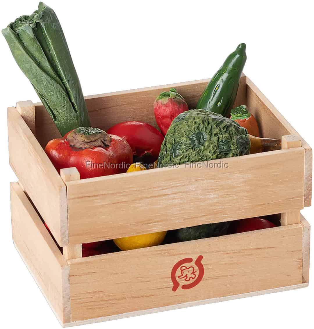En tur till marknaden är veckans höjdpunkt för dina Maileg-vänner, och nu kan de ta med sig sin alldeles egna skörd hem. Detta utsökta set fångar den enkla glädjen, med en robust trälåda fylld med ett färggrant sortiment av handmålade frukter och grönsaker. Man kan nästan känna purjolökens krispighet och de små jordgubbarnas sötma. De detaljerade texturerna, från den knottriga broccolin till den släta tomaten, bjuder in till att titta närmare och gör varje del till en liten skatt.