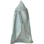 Varje älskad Maileg-vän förtjänar en alldeles särskild plats att vila sitt huvud på. Denna utsökta miniatyrsänghimmel är mer än bara ett tillbehör; den är början på en saga. Föreställ dig din lilla mus eller kanin nedbäddad för natten, där det mjuka mintfärgade tyget skapar en fridfull oas runtomkring dem och lovar de allra sötaste drömmar. Tygets mjuka fall och den viskande guldbruna kanten förvandlar en enkel sovhörna till en scen ur en älskad saga och inspirerar till timmar av stillsam, fantasifull lek.
