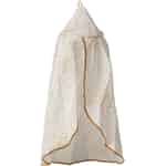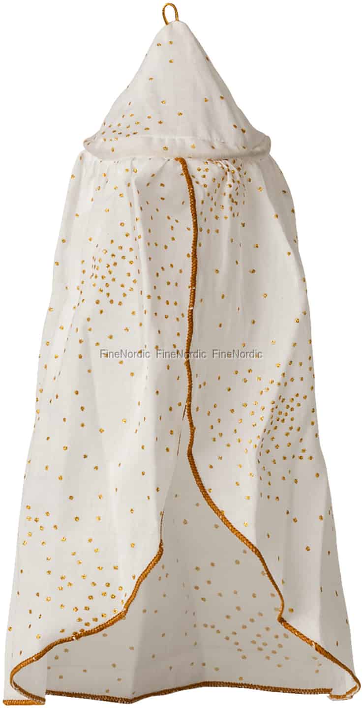 Varje älskad Maileg-vän förtjänar en alldeles särskild plats att vila sitt huvud på. Denna utsökta miniatyrsänghimmel förvandlar en enkel säng till en kunglig kammare eller en magisk skogsglänta. Det mjuka, off-white tyget draperas vackert, prytt med skimrande guldprickar som fångar ljuset likt avlägsna stjärnor. En fin, flätad guldkant ramar in tyget och ger en sista touch av sagolik charm till denna förtrollande skapelse.