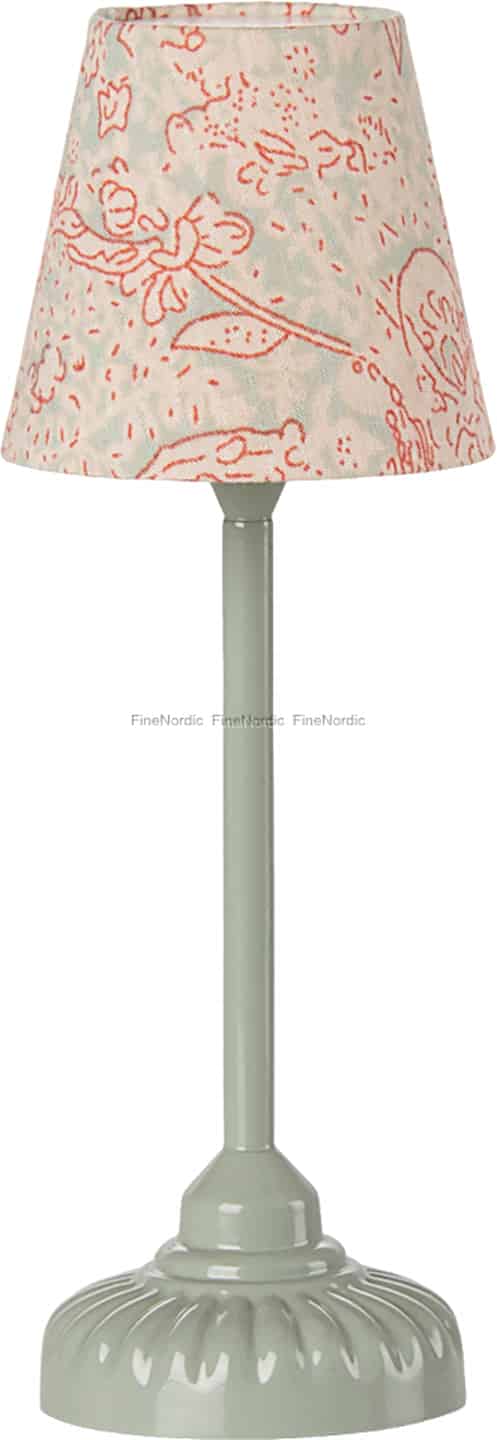 Varje miniatyrhem behöver de där speciella detaljerna som får det att kännas riktigt ombonat, och denna vackra golvlampa i vintagestil från Maileg gör precis det. Föreställ dig din lilla musfamilj samlad i soffan, där de delar historier från dagen medan lampan sprider ett varmt och tryggt ljus omkring dem. Den mjukt mintgröna foten har en klassisk, räfflad design, medan tygskärmen pryds av ett fint, rostfärgat blommönster som väcker minnen av en sommarstuga.