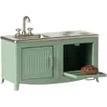 - Autentisk vintagecharm: Den klassiska mintgröna färgen, den räfflade skåpsluckan och den silverfärgade diskhon med kran ger en touch av nostalgisk charm till din Maileg-värld och får varje scen att kännas autentisk.