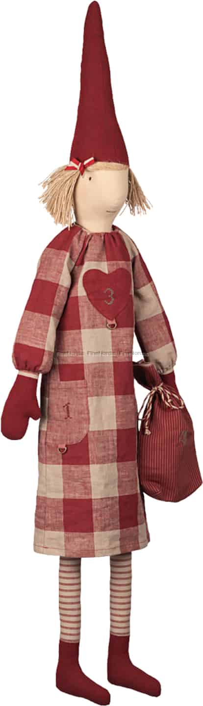 Föreställ dig glädjen när denna rara nissevän finner sin plats i ert hem, kanske tyst sittande i en favoritfåtölj eller hängande vid den öppna spisen, med sitt söta, broderade ansikte som vakar över julförberedelserna. Hennes vackert sydda textilklänning, med sitt mjuka, rutiga mönster och hjärtformade fickor, bjuder in nyfikna händer att upptäcka de små gåvorna du har gömt för varje söndag i advent. Hon är mer än en kalender; hon är en bevarare av hemligheter och en följeslagare under den mest underbara tiden på året.