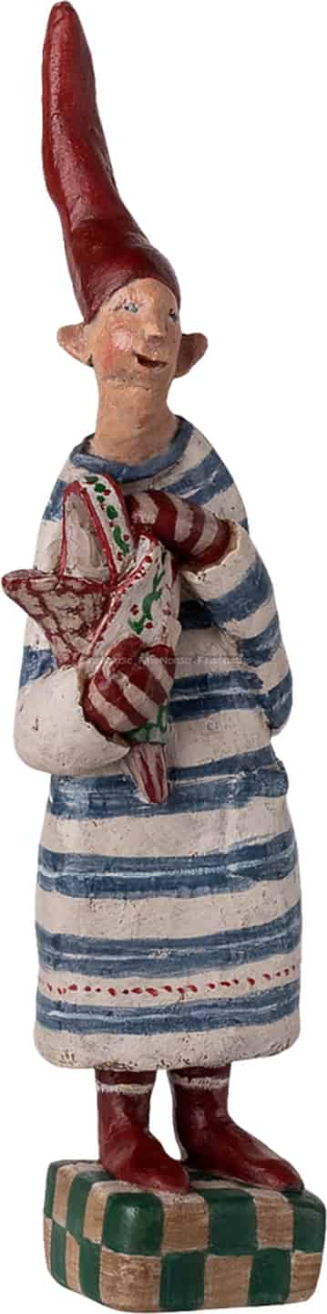 rets karaktär, nr 36, är inget undantag. Med rosenröda kinder och en glimt i ögat står han stolt på sitt rutiga block, klädd i sin blå- och vitrandiga favorittunika. Han håller i en liten säck där en vackert dekorerad julstrumpa kikar fram, en antydan om de små glädjeämnen och överraskningar han har samlat ihop till hushållet. Hans höga röda luva, ett signum för hans klan, vickar lätt när han vakar över hemmet och ser till att allt är lugnt och fridfullt.