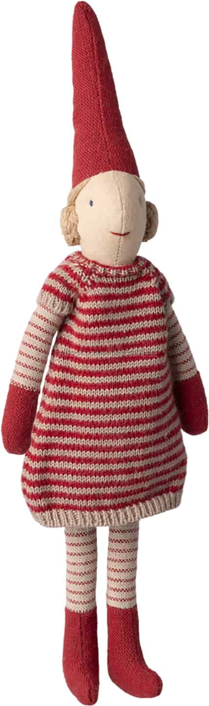 Möt din nya julvän från Mailegs förtrollande värld. Klädd i en mysig, stickad klänning med röda och gräddvita ränder är denna lilla nisseflicka redo att dela värmen och glädjen i din familjs jultraditioner.